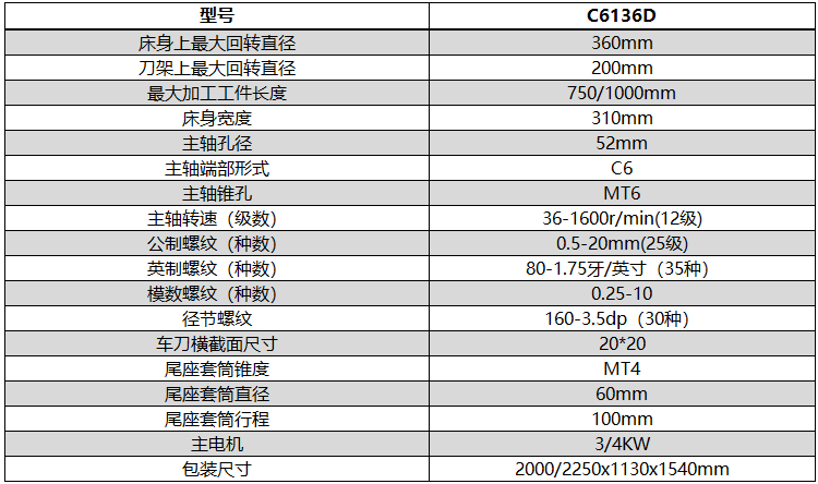 C6136D普通车床,具有车削圆柱面、圆锥面、圆弧面、内孔、切槽及各种螺纹等加工功能,适用于各种零件的单件、小批或成批生产。床身导轨和床头箱齿轮经淬硬和精密磨削。